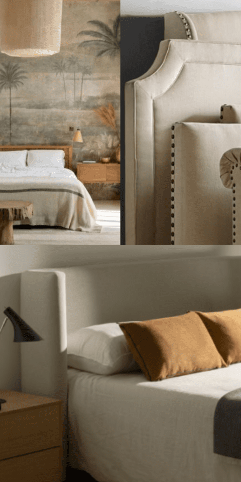 • Cabeceros acolchados en terciopelo o lino, con capitoné, costuras verticales o formas curvadas (como el estilo wingback)
